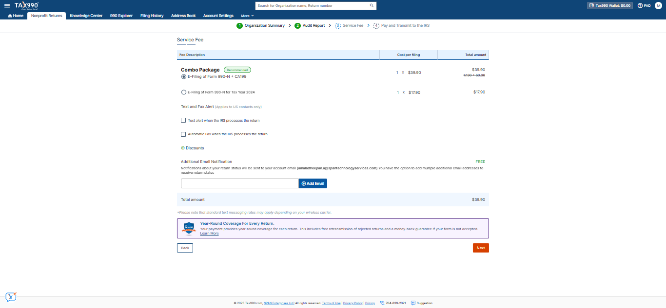 Step 7: You can add optional text and fax alerts for when the IRS processes the return. Then, click ‘Next’ to proceed.