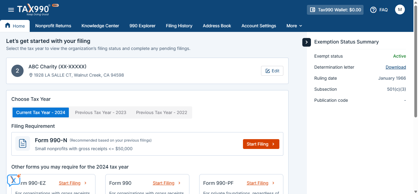 Step 2: You can find the organization’s details and the filing status of the EIN you’ve searched for (fetched from the IRS). Click ‘Start Filing’ to begin filing a new 990-N return.