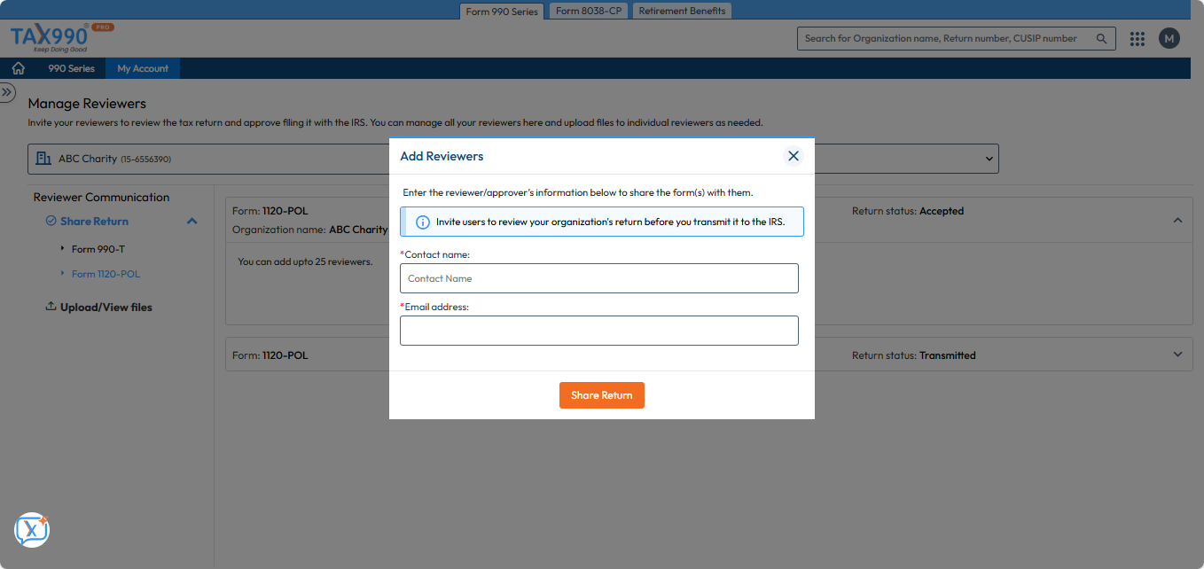 Tax990 allows you to invite your organization members to review and approve tax forms before transmitting them to the IRS. You can add multiple users to review/approve your form.