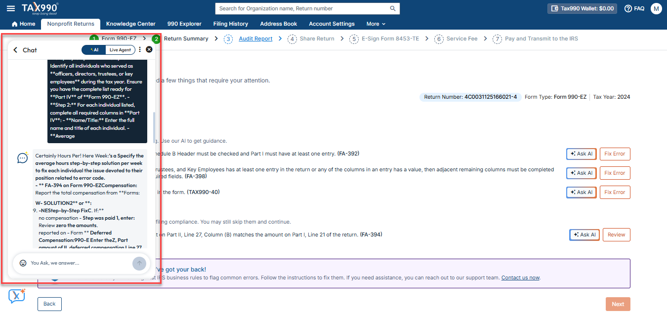 How can I use Tax990 AI to fix the errors on my 990 form?